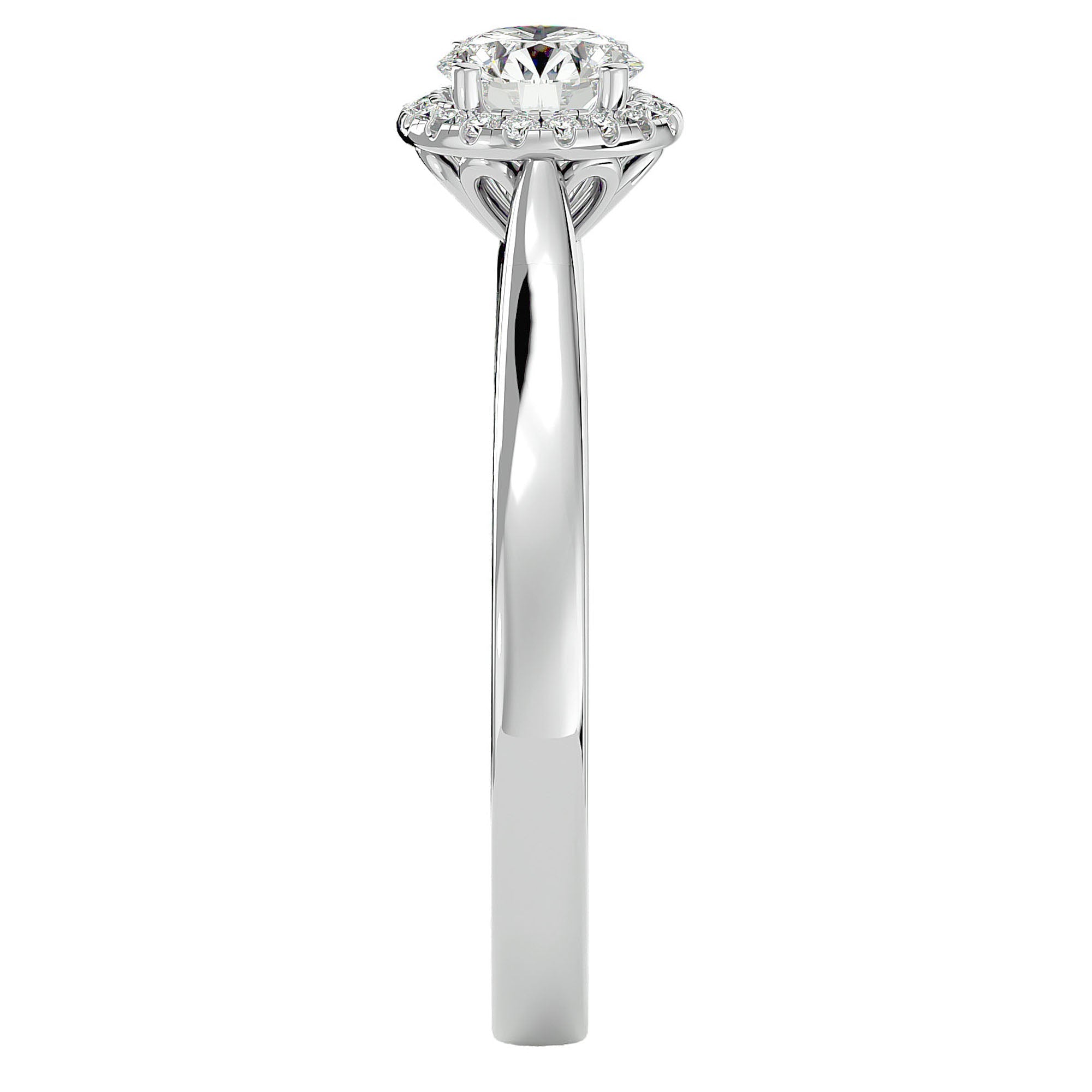 Centrul inelului este dominat de un diamant creat în laborator de 0.54 ct, montat într-un cadru Halo care amplifică strălucirea sa creat în laboratoră. Fiecare diamant este ales cu grijă și setat cu măiestrie pentru a reflecta lumina într-un mod spectaculos, conferind bijuteriei o aură de eleganță pură.