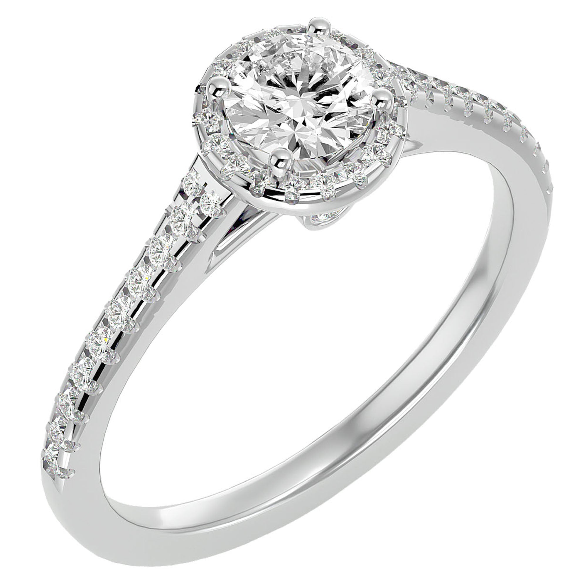 Piesa centrală a acestui inel este un diamant creat în laborator de 0.74 ct, tăiat în formă rotundă, renumit pentru capacitatea sa de a capta și reflecta lumina într-un mod spectaculos. Înconjurat de un halo de diamante mai mici, acest design pune în evidență diamantul principal, amplificându-i strălucirea și oferindu-i un aspect de poveste.