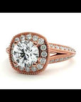 Designul acestui inel este o veritabilă capodoperă, cu moissanite de 1.61 ct dispuse într-un Halo Duo Etern Pavé. Fiecare diamant, selectat cu grijă, strălucește magnific, capturând și reflectând lumina într-un dans fascinant de sclipiri. Halo-ul Duo Etern simbolizează o iubire crescândă și durabilă, un omagiu adus legăturii profunde și eterne dintre două suflete.