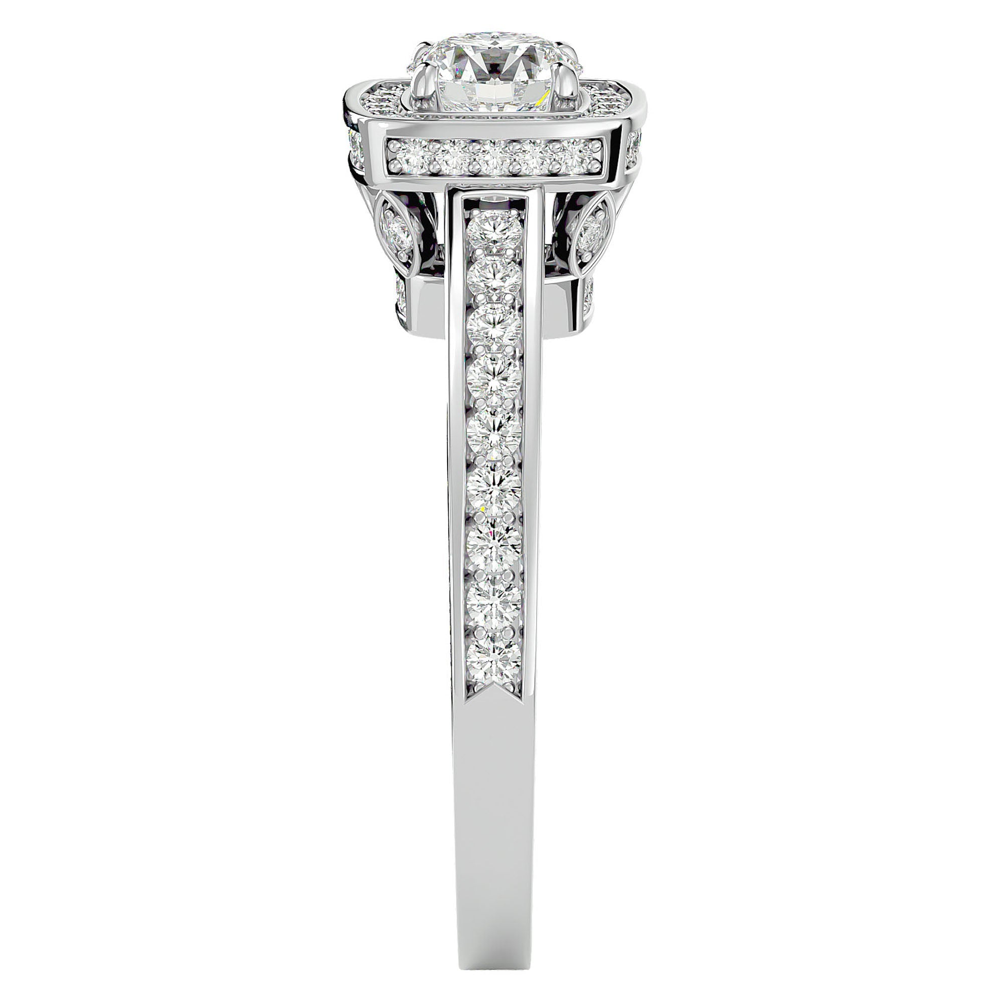 Piesa centrală este un moissanite de 1.41 ct, tăiat cu precizie în formă Brilliant, înconjurat de un cadru Halo și diamante pavé meticulos montate. Acest design sofisticat amplifică strălucirea diamantului principal, creând o lumină captivantă care reflectă esența unei eleganțe regale.