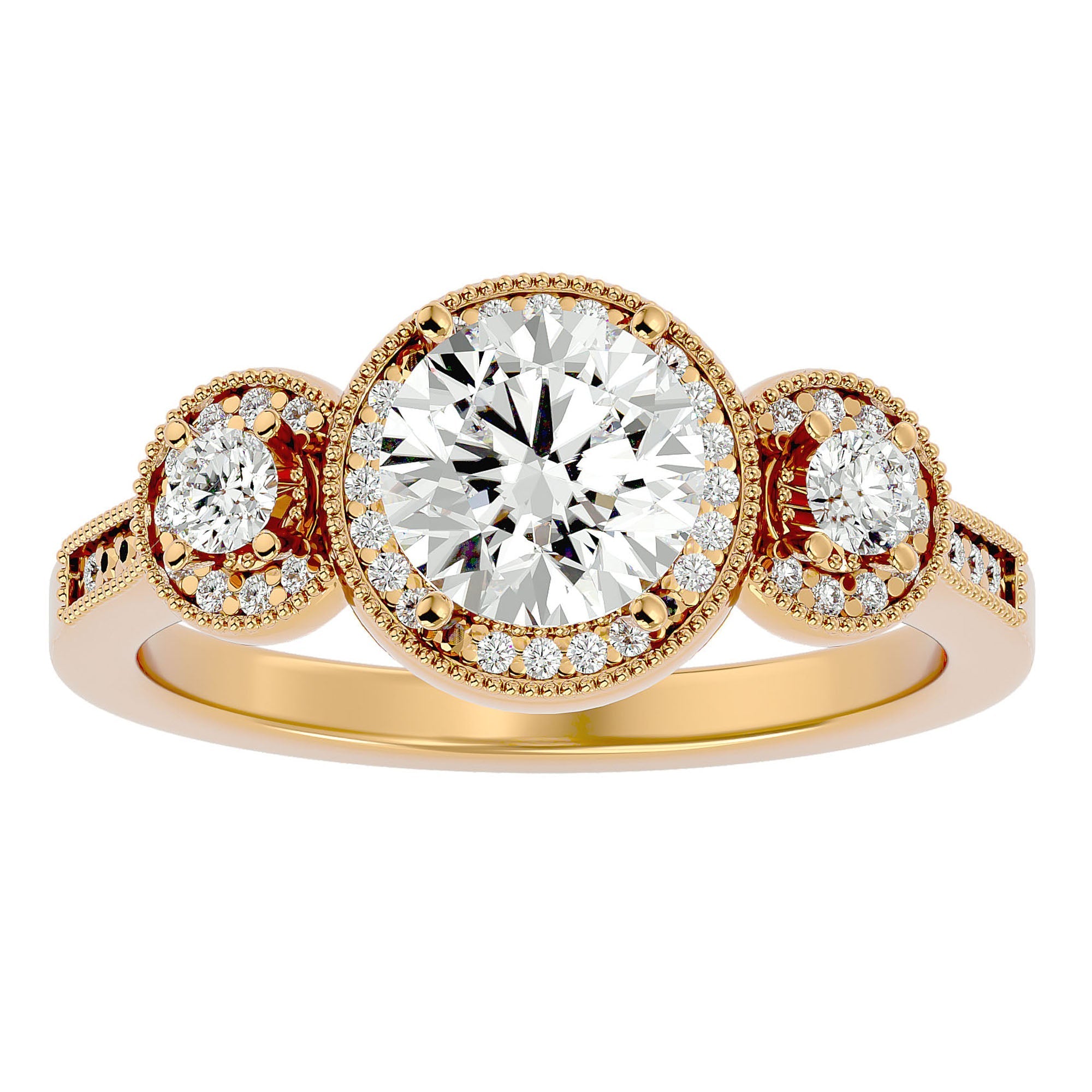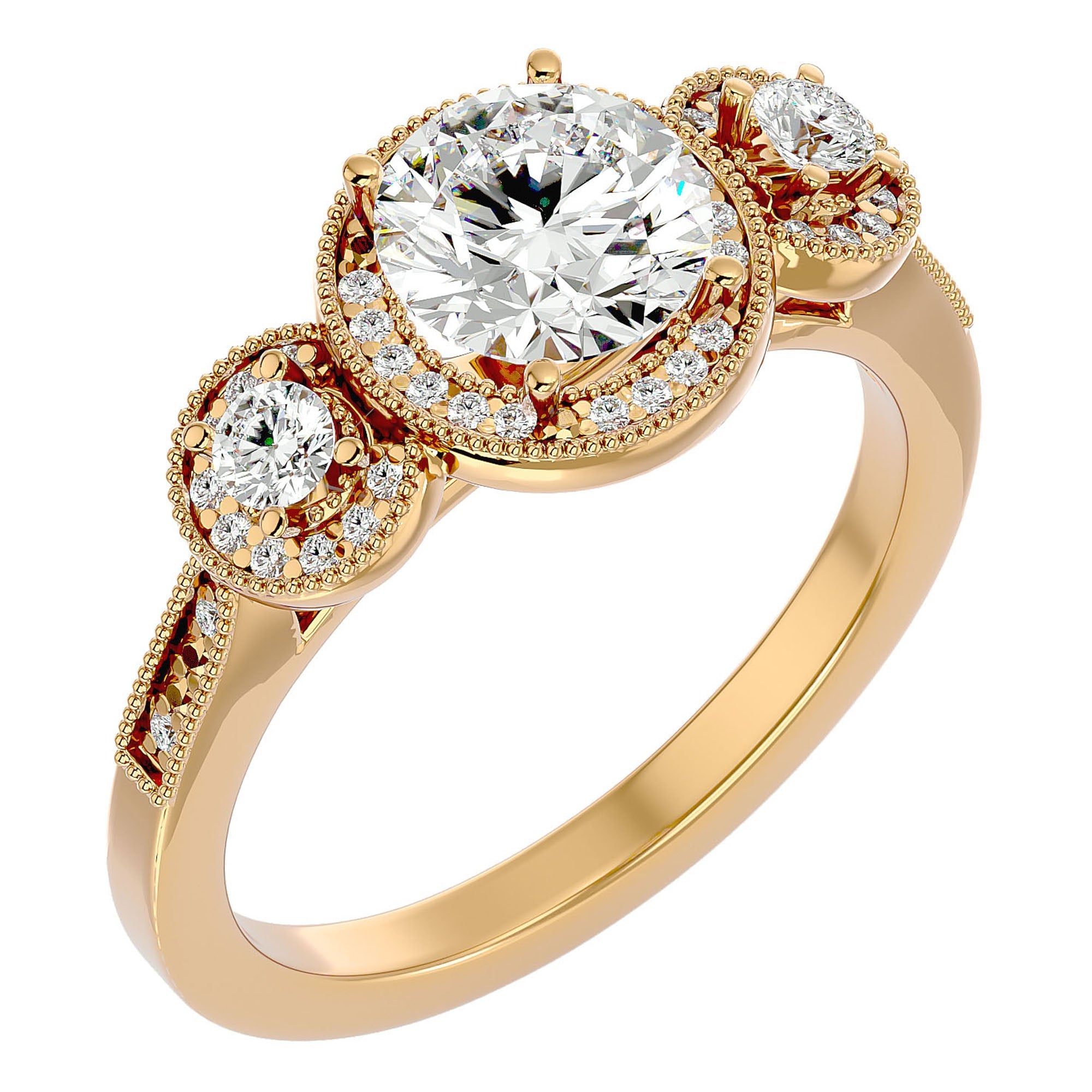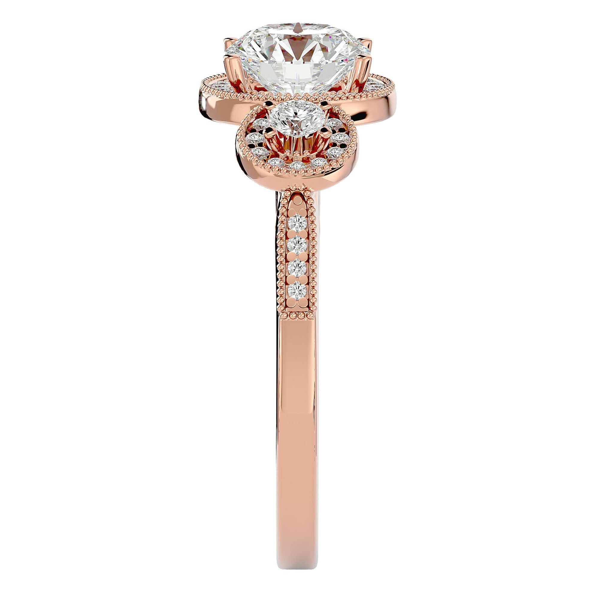 Inelul de Logodnă Vintage este finisat din aur de 14k, disponibil în variantele de Aur Alb, Aur Galben, Aur Roz sau Platina. Această selecție permite adaptarea inelului la preferințele individuale, accentuând frumusețea antichizată și rafinamentul fiecărui diamant. Designul vintage, cu trei diamante principale impresionante, este completat de detalii minuțioase care adaugă profunzime și textură, captând lumina într-un mod ce îmbogățește strălucirea naturală a pietrelor.