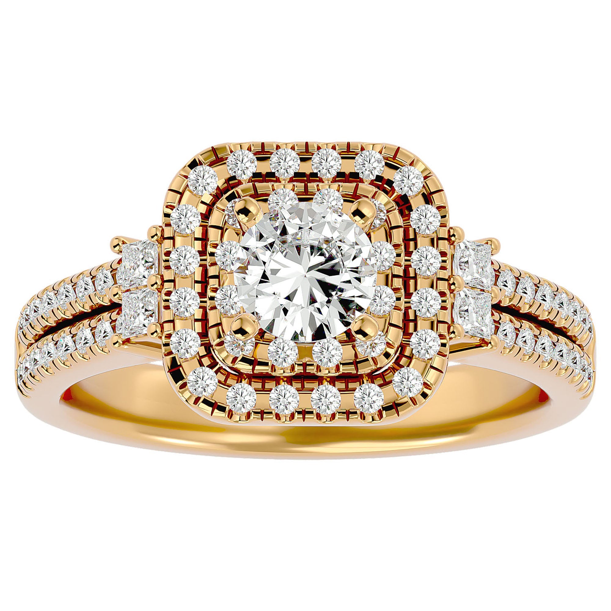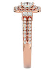 Cu moissanite de 0.74 ct, atent selecționate pentru puritatea și strălucirea lor, acest inel este o adevărată capodoperă. Designul pavé halo pune în valoare frumusețea centrală a pietrei, creând o aură de lumină care reflectă o eleganță atemporală și un lux discret.