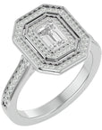 Fabricat din aur de 14k, acest inel splendid poate fi personalizat în aur alb, aur galben, aur roz sau platina, oferindu-vă posibilitatea de a alege nuanța perfectă pentru stilul dumneavoastră. Diamantul principal, cu tăietură smarald, este înconjurat de un cadru halo de diamante naturale, creând un efect de strălucire spectaculos.